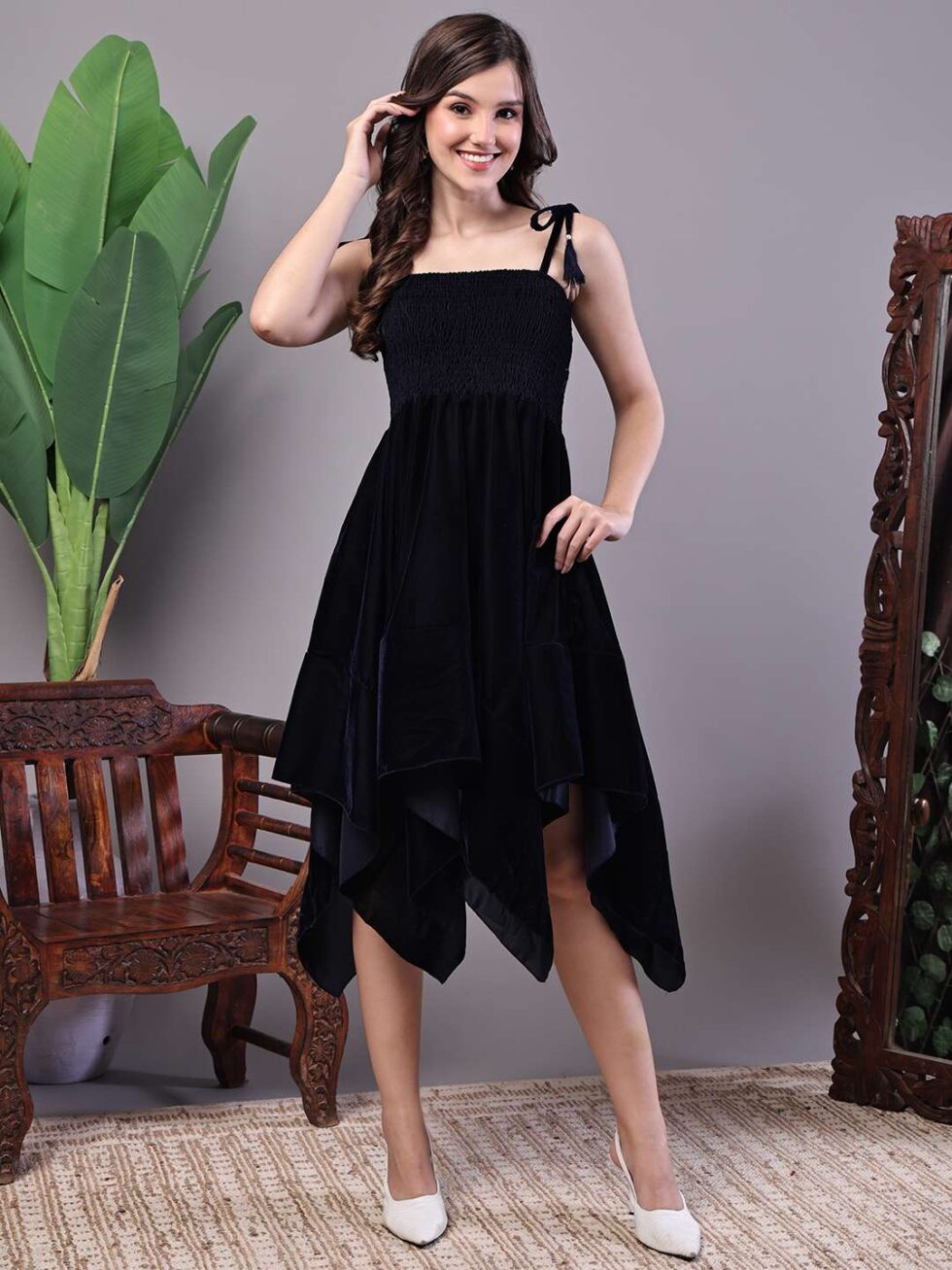 Effortlessly stylish dress with a vibrant abstract print, tie-up shoulder straps, and a chic high-low handkerchief hemline ? perfect for casual days or evening gatherings.