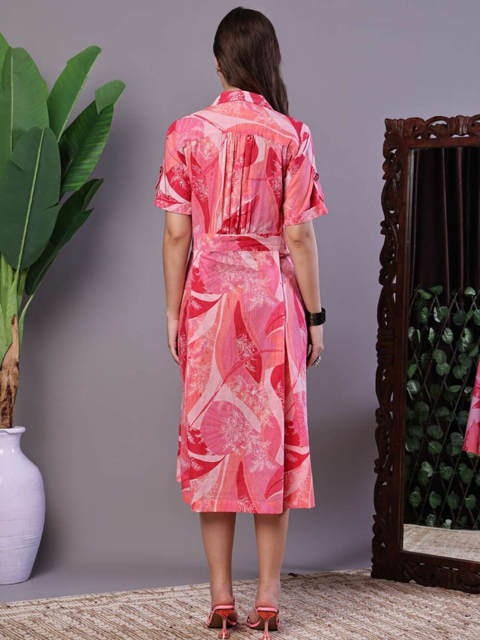 Women’s Pink Printed Cotton Midi Shirt Dress